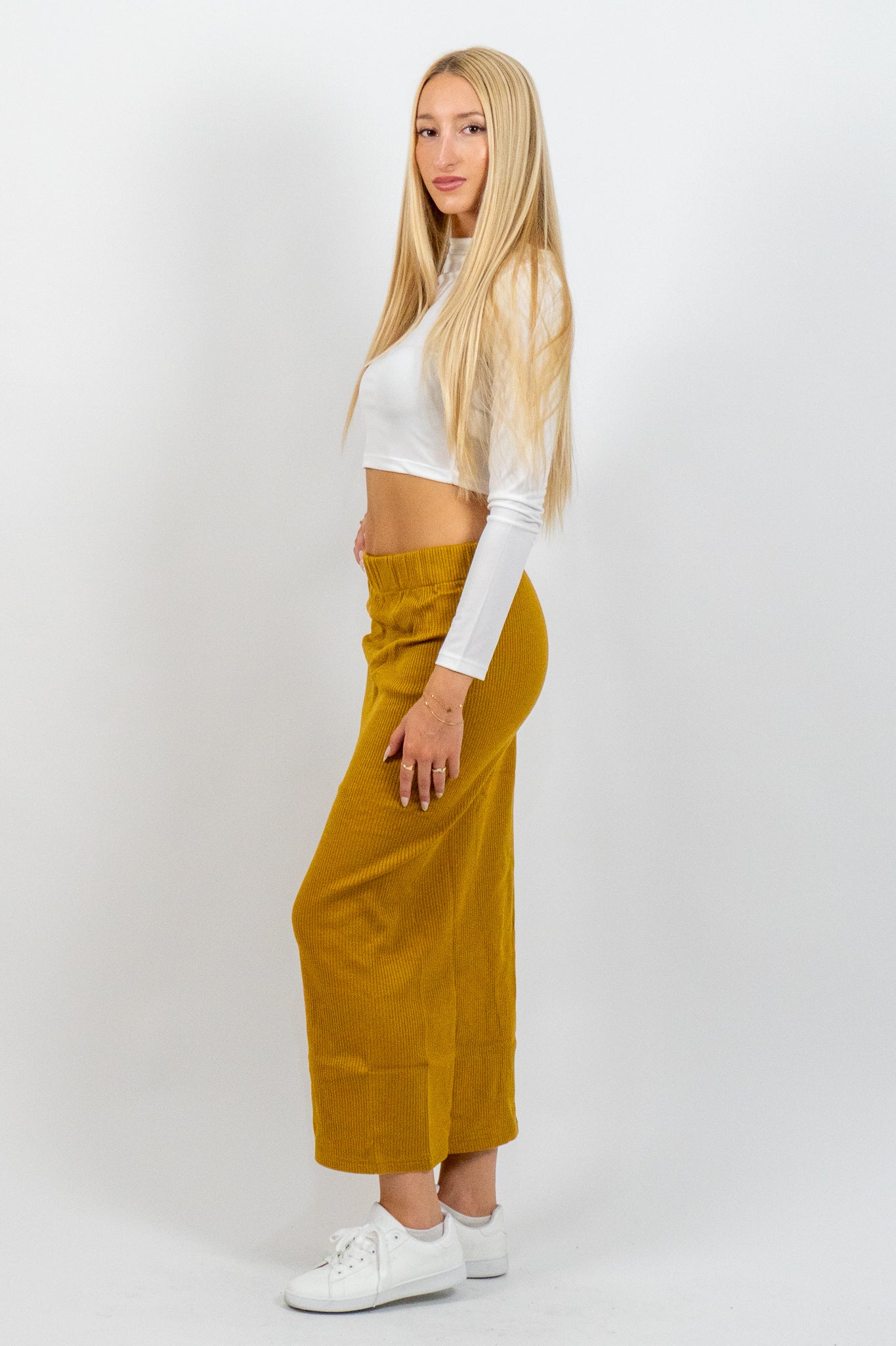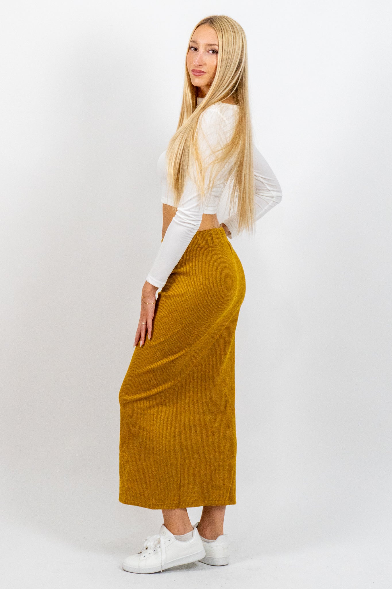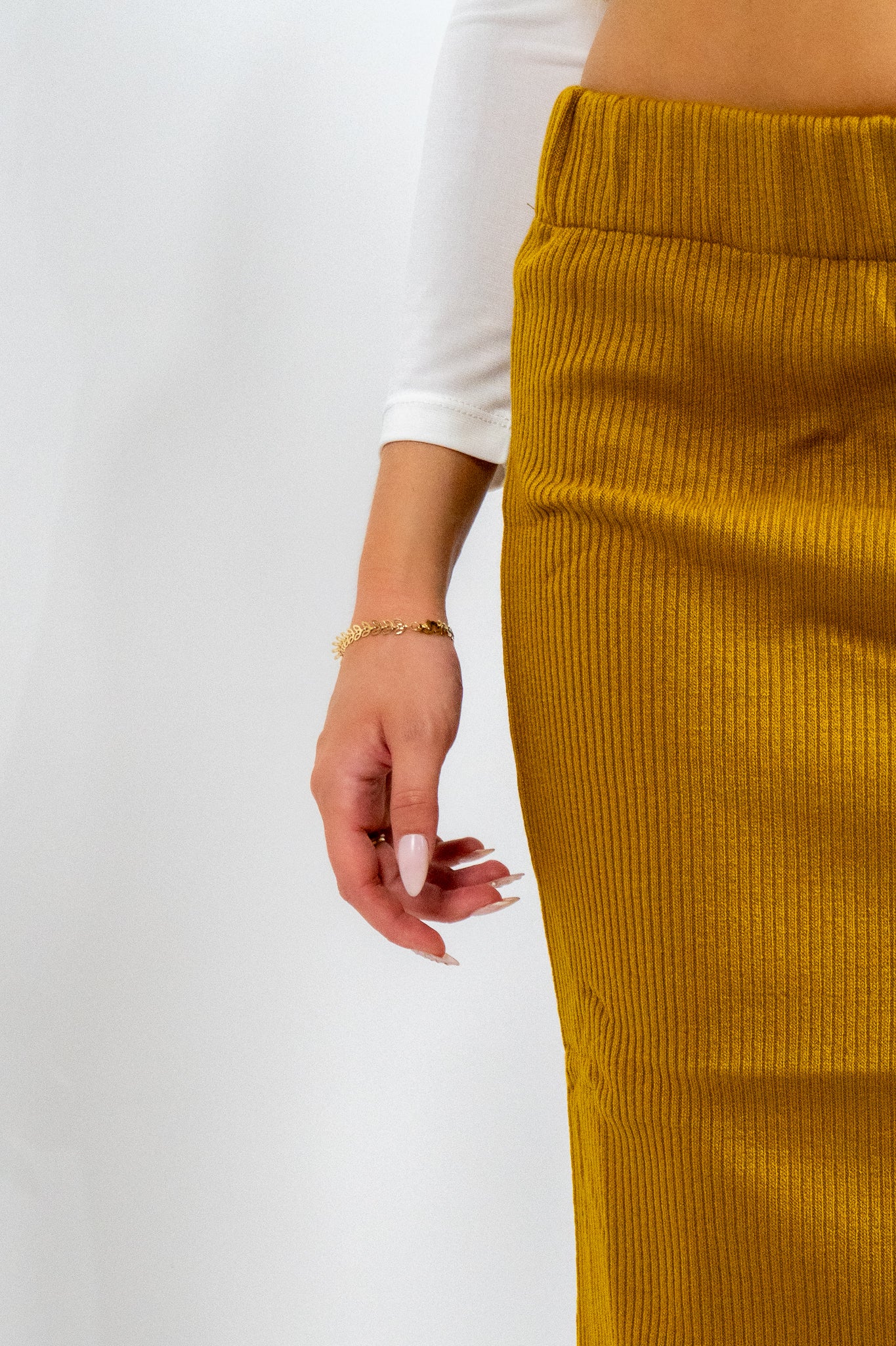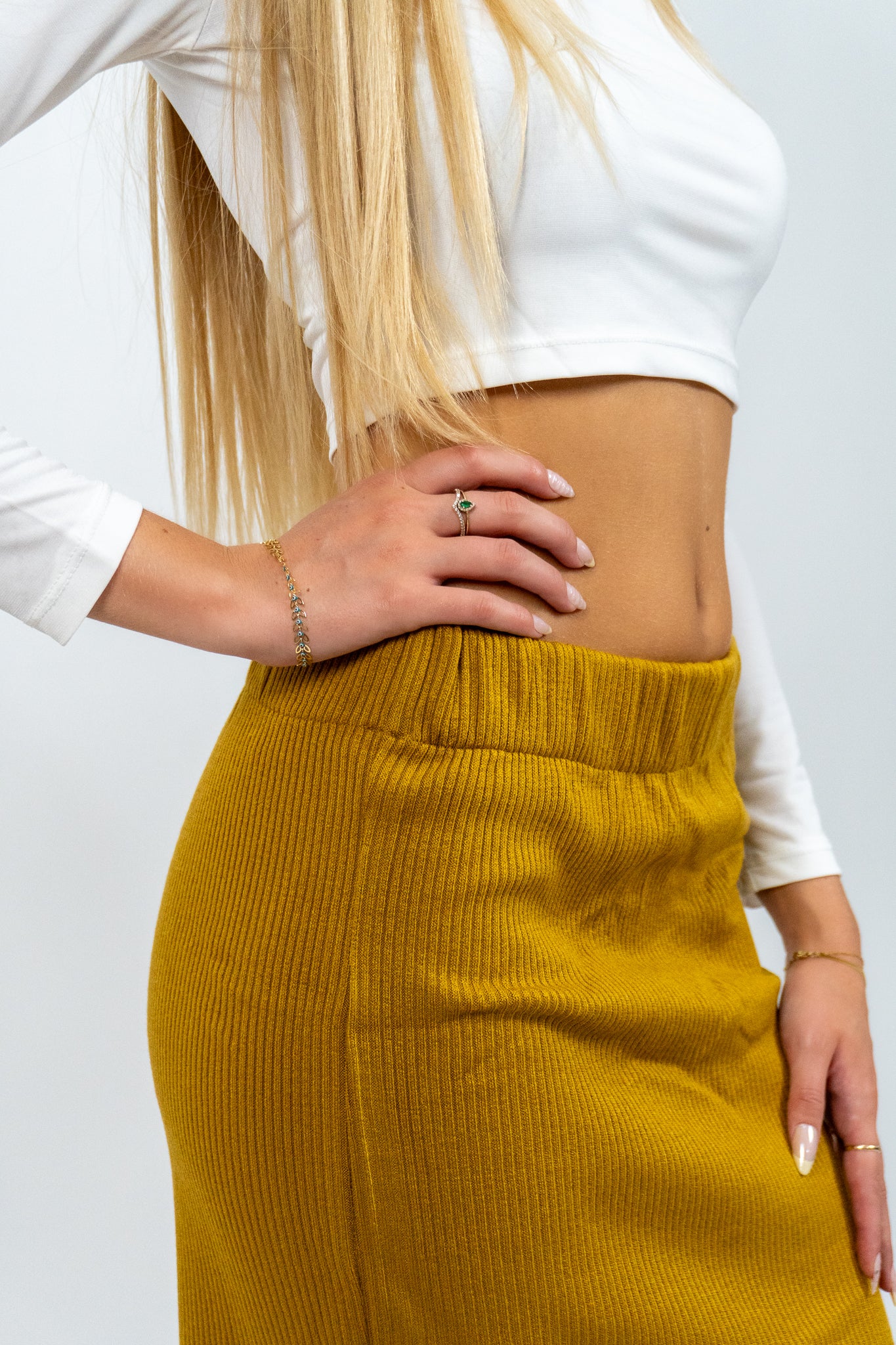 Με ζεστή μουσταρδί απόχρωση και ελαστική μέση, αγκαλιάζει τη σιλουέτα ενώ παραμένει ευκολοφόρετη για όλη την ημέρα.