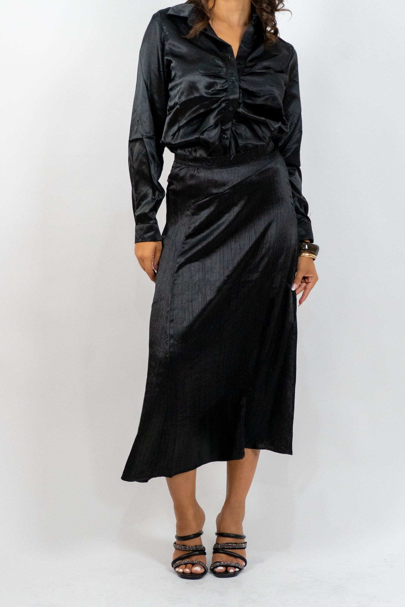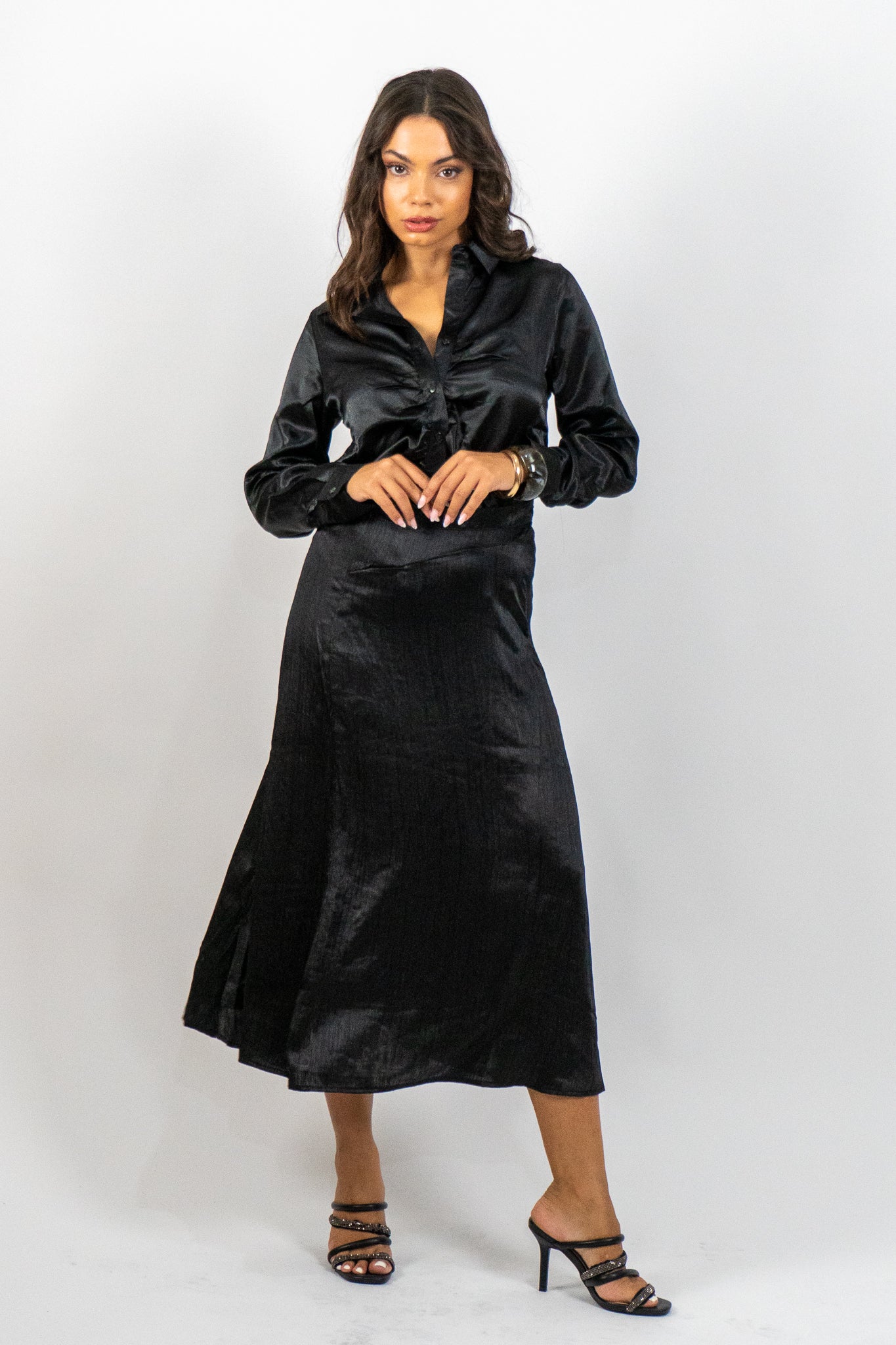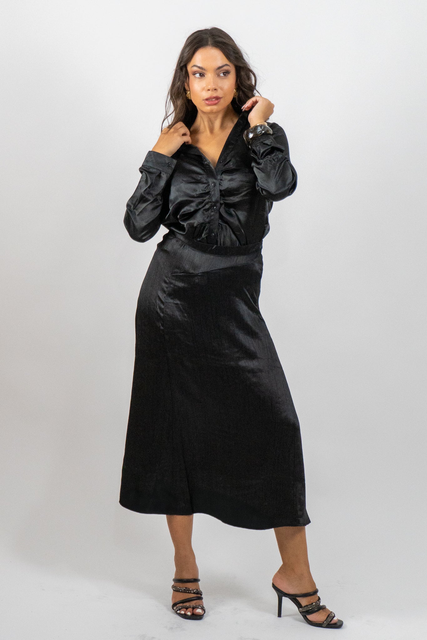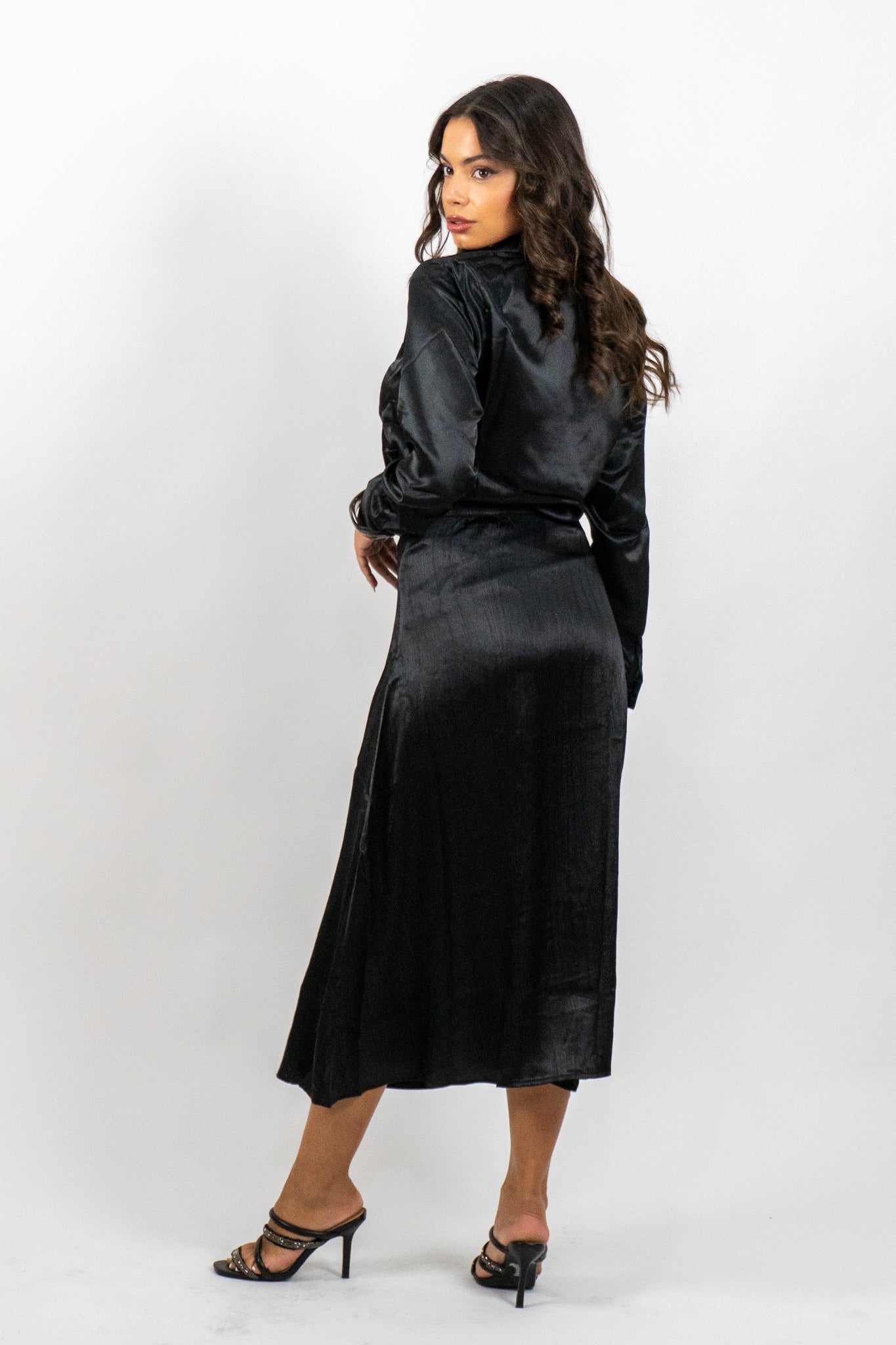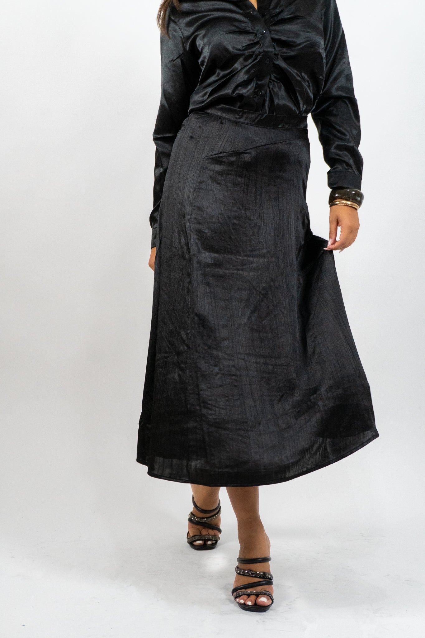 Το σατέν ύφασμα δίνει λάμψη και πολυτελή υφή, ενώ το midi μήκος την κάνει ιδανική για κάθε περίσταση.