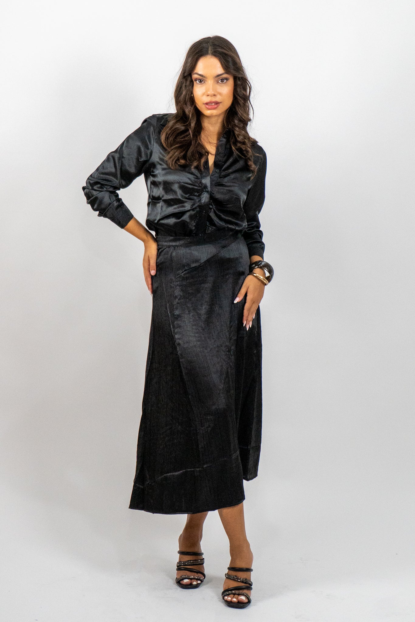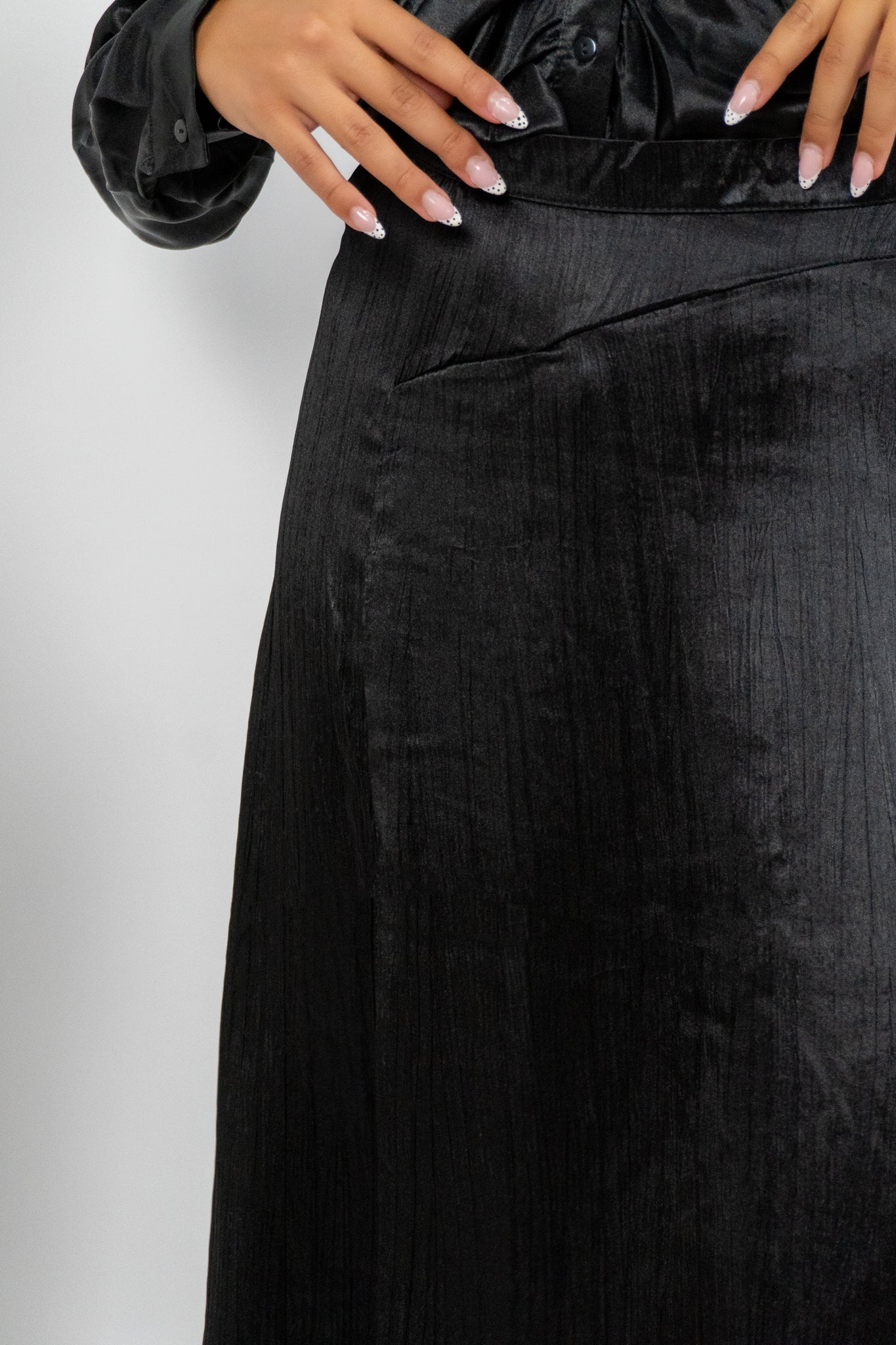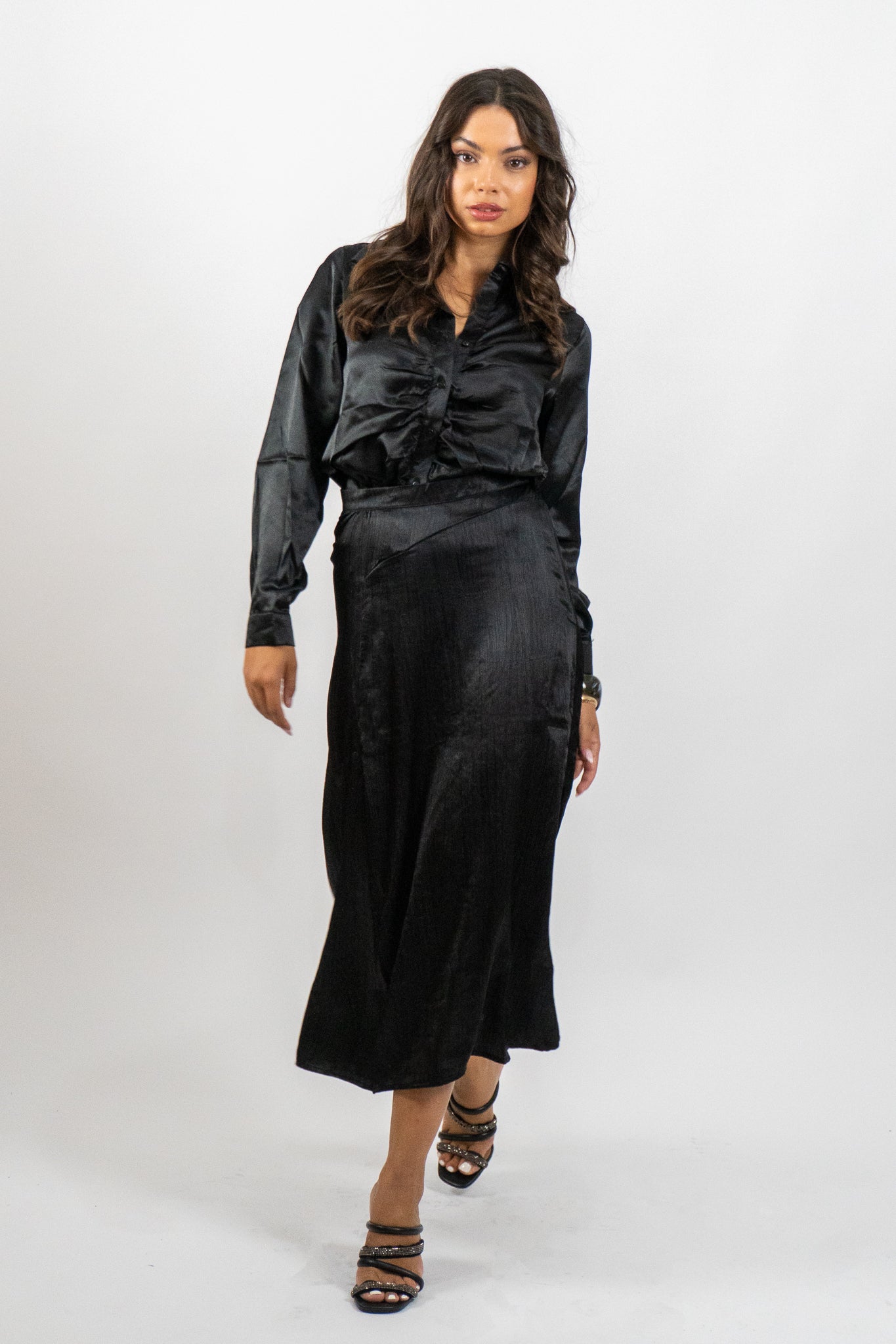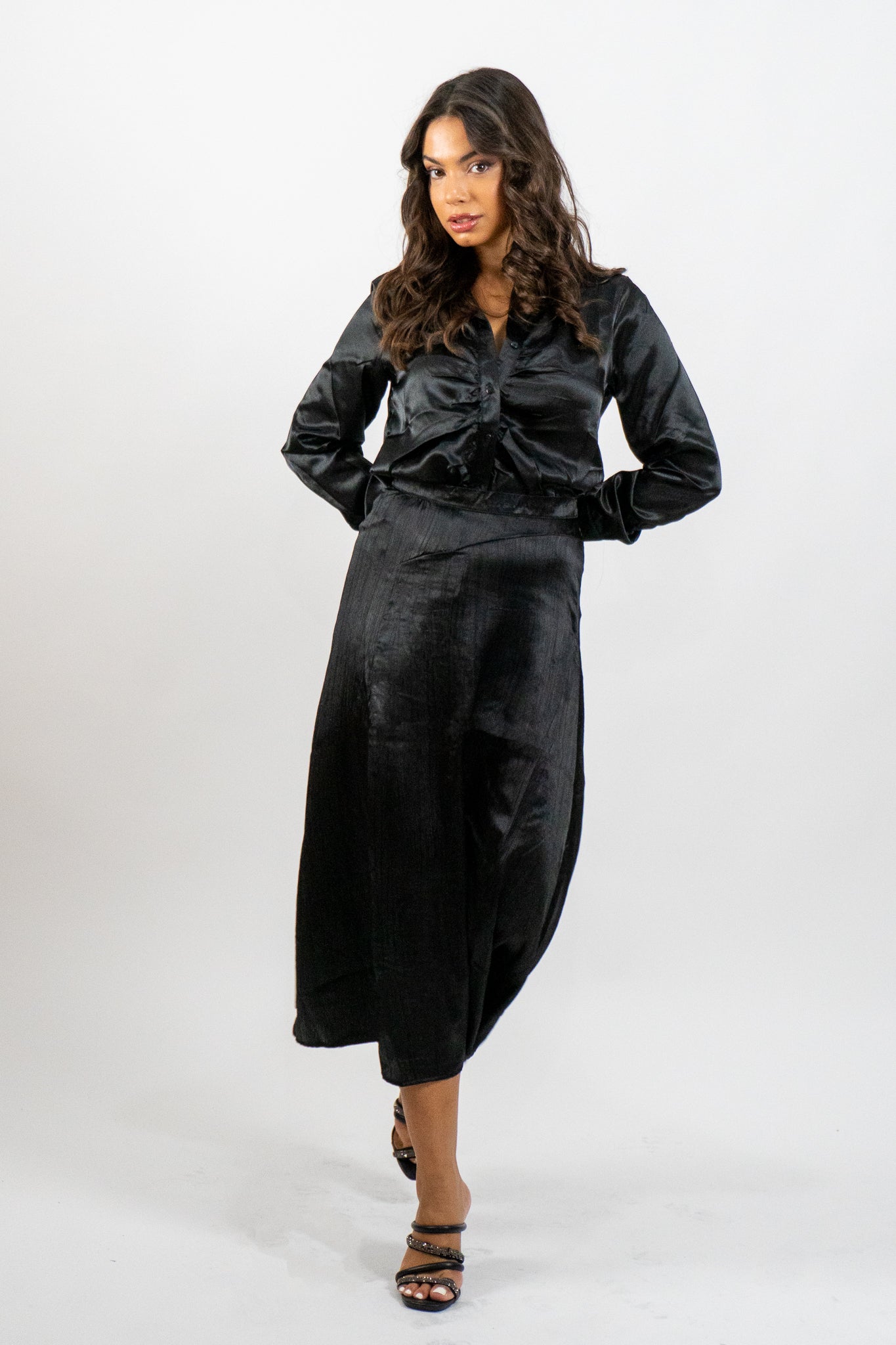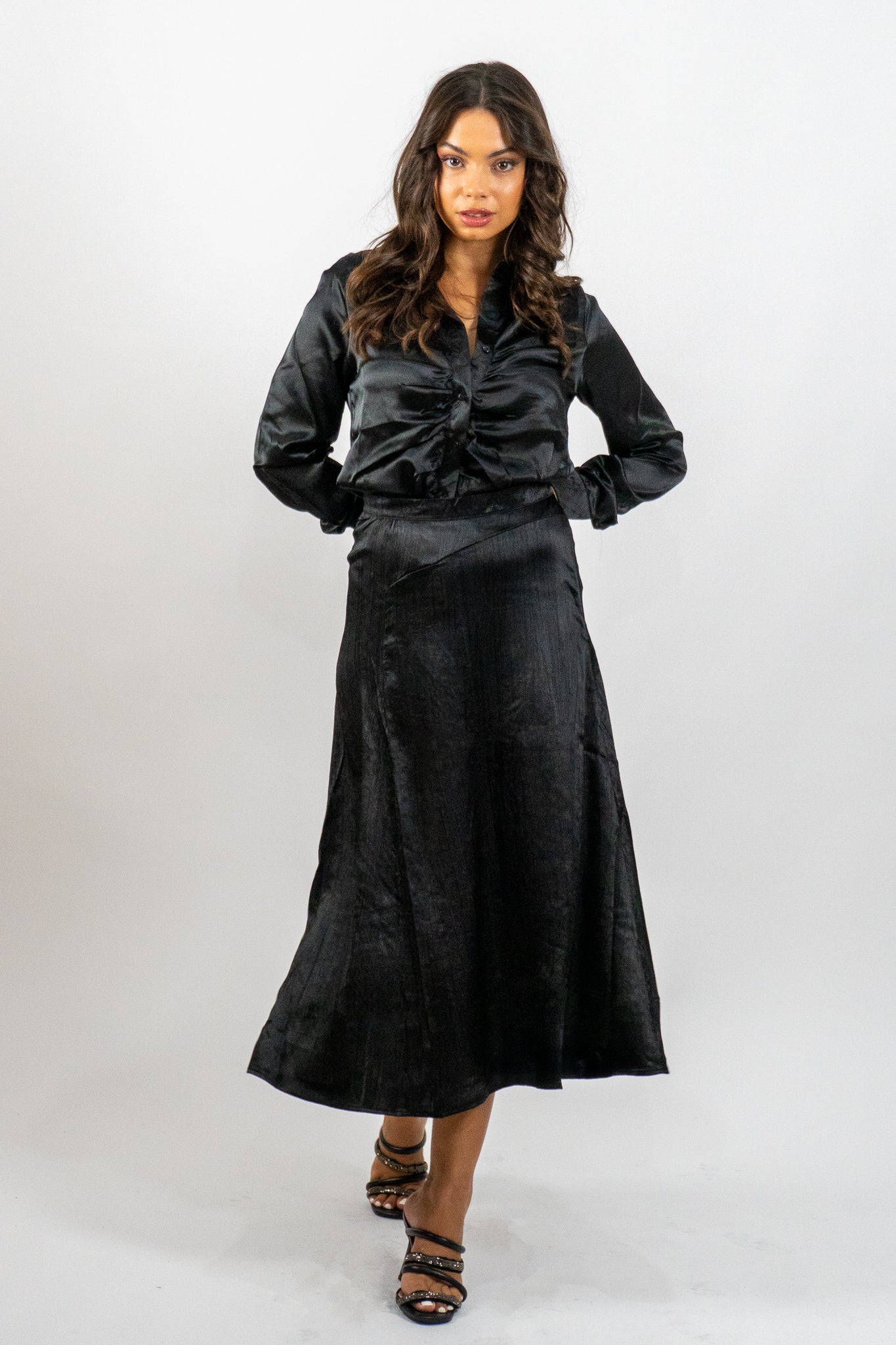 Το σατέν ύφασμα δίνει λάμψη και πολυτελή υφή, ενώ το midi μήκος την κάνει ιδανική για κάθε περίσταση.